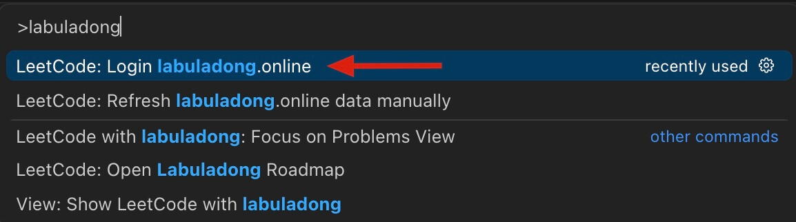 在 vscode 中按下 F1 键,vscode 会弹出一个命令弹窗,输入关键词 labuladong,可以看到一个 Login labuladong.online 的选项: