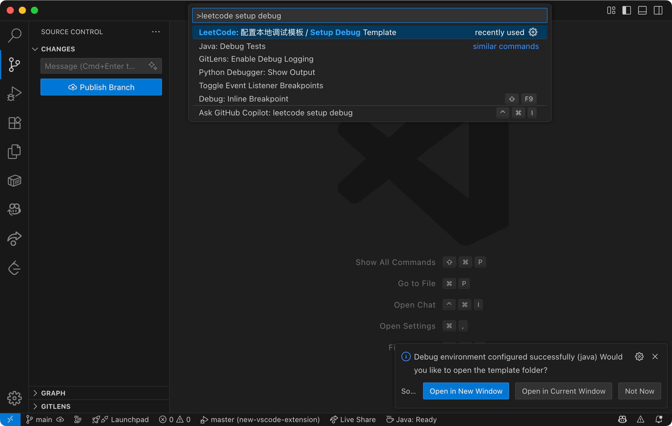 在 vscode 的命令输入框(Mac 快捷键 Cmd + Shift + P,Windows 快捷键 Ctrl + Shift + P)中输入关键词 leetcode setup debug,找到自动配置模板的命令按回车。